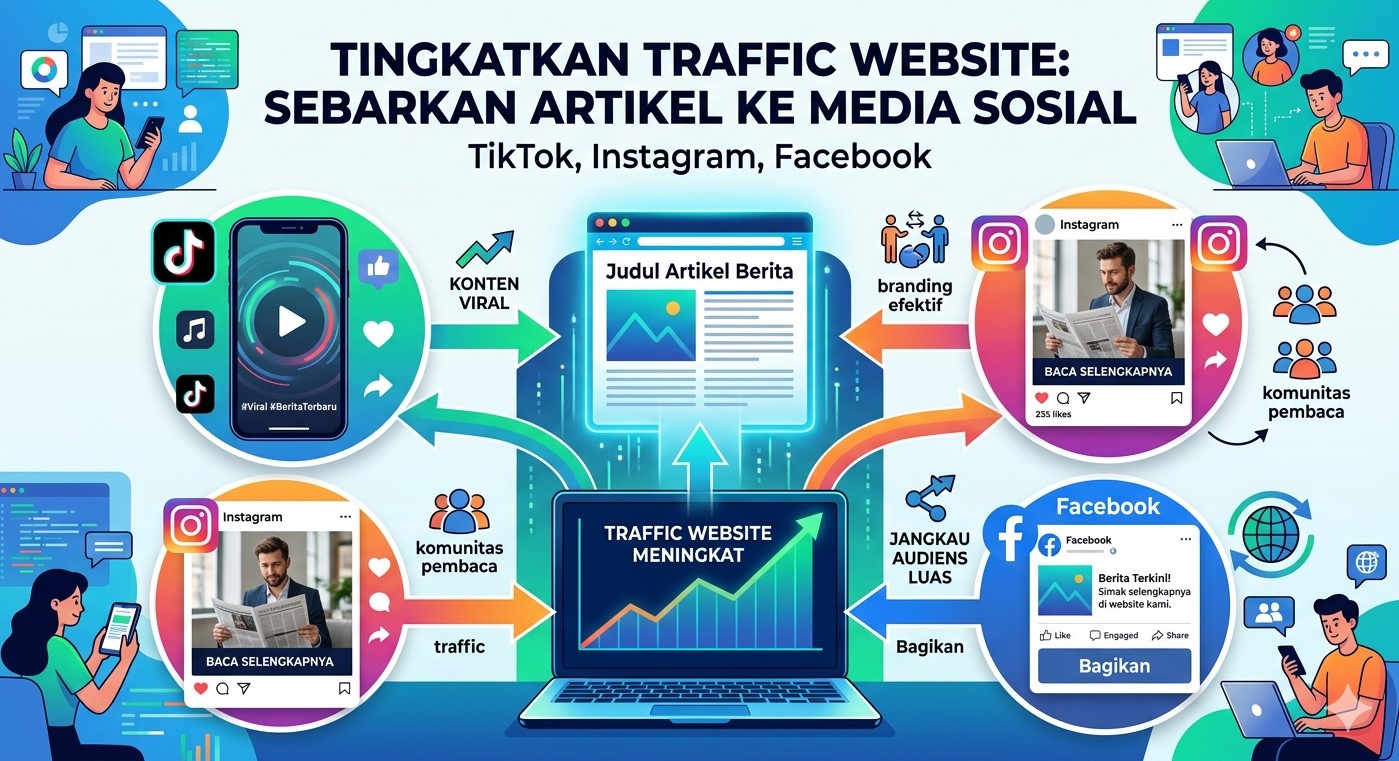 Media sosial adalah salah satu sumber traffic terbesar untuk website berita saat ini. Dengan membagikan artikel ke platform seperti TikTok, Instagram, dan Facebook, Anda bisa menjangkau audiens yang lebih luas dalam waktu singkat. Konten yang menarik bahkan bisa menjadi viral dan mendatangkan ribuan pengunjung dalam sehari.