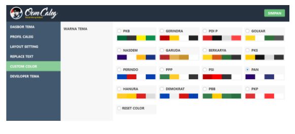 Sesuai dengan kebutuhan berbagai macam partai peserta pemilu, maka web Caleg dilengkapi dengan 16 Warna Pilihan dan masih bisa di kustomisasi sesuai kebutuhan.
