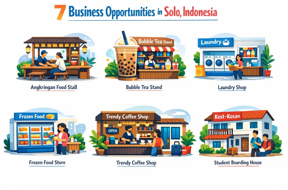 Kota Solo memiliki banyak peluang bisnis yang bisa dijalankan dengan berbagai tingkat modal. Mulai dari usaha kecil seperti angkringan hingga investasi properti seperti kos mahasiswa.