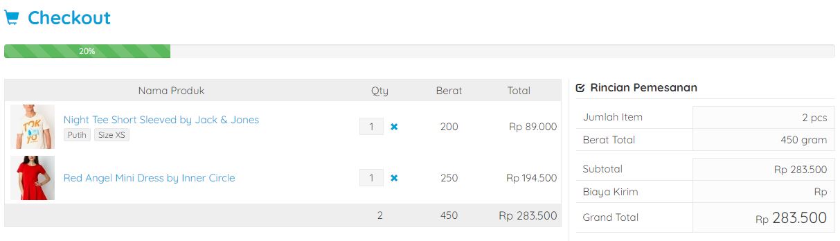 Fitur keranjang dan checkout akan memudahkan pengunjung untuk melihat barang yang mereka beli beserta subtotalnya sebelum melakukan pembayaran. Di menu checkout ini juga terdapat penghitungan ongkir otomatis dan formulir pemesanan.