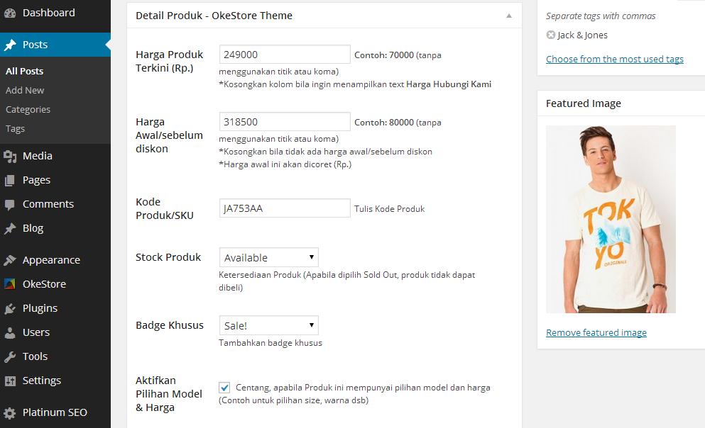 OKESTORE memiliki panel produk atau menu posting produk tersendiri. Di sini anda bisa memasukkan informasi-informasi produk yang dijual seperti harga, diskon, kode produk, stok, label, berat, varian, gambar, dan lain-lain.